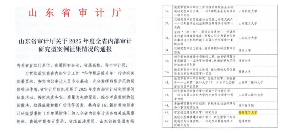 近日,山东省审计厅公布了《山东省审计厅关于2025年度全省内部审计研究型案例征集情况的通报》,我校提报的《智慧校园建设项目审计研究范例》获评2025年全省优秀内部审计研究型案例,并纳入全省内部审计实务攻关成果案例库。